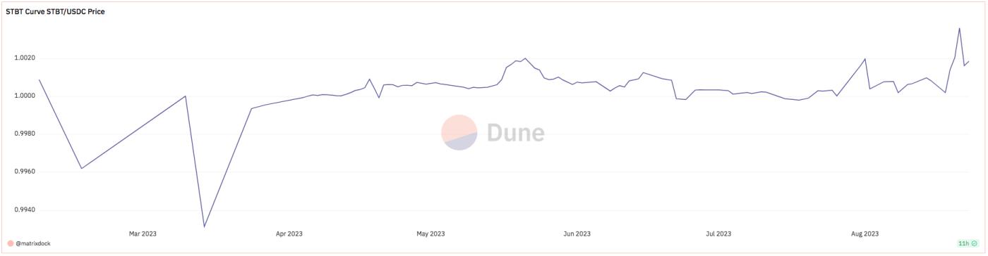 在其短暂的历史中(自 2023 年 2 月以来),STBT 并未经历过重大的脱钩事件。 3 月 14 日,即流动性注入 Curve 资金池一周后,价格短暂下跌至 0.9931 美元。