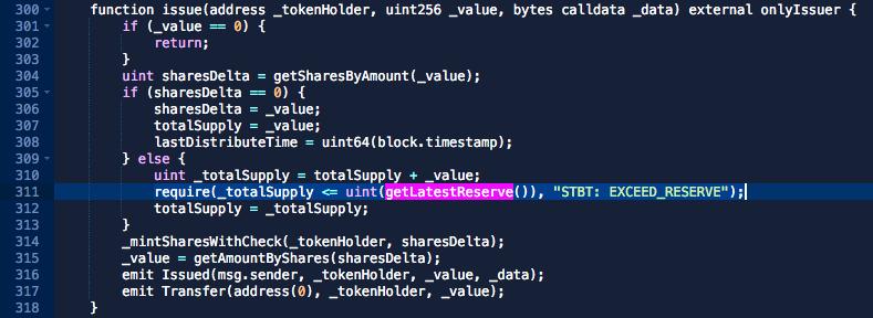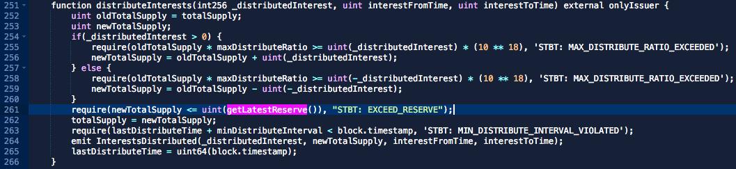 issue- 向有权接收 STBT 的地址发行新代币,并根据 ReserveFeed 报告的值强制执行铸币限制redeem- 兑换属于管理员的代币redeemFrom- 为了处理赎回,用户首先调用approve一些值以由时间锁合约(所有者)赎回。然后发行者可以从代币持有者的地址redeemFromdistributeInterests- 分配应计利息,检查该值不超过maxDistributeRatio或reserveFeed报告的总储备值,并且自上次调用以来的时间大于minDistributeRatio