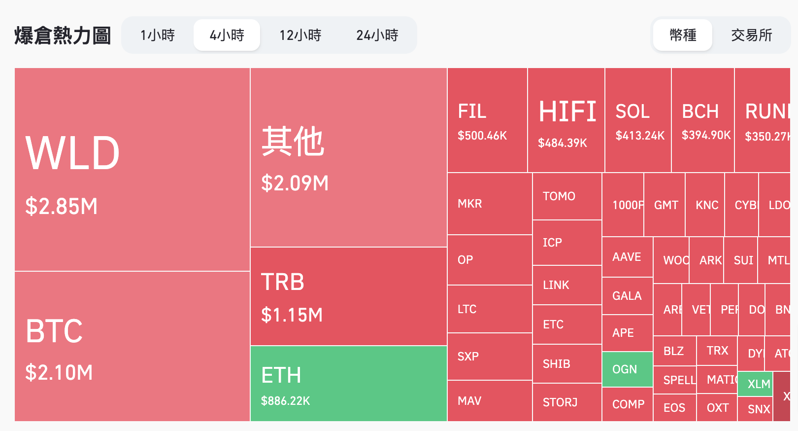 WLD 近 4 小时爆仓 285 万美元名列第一