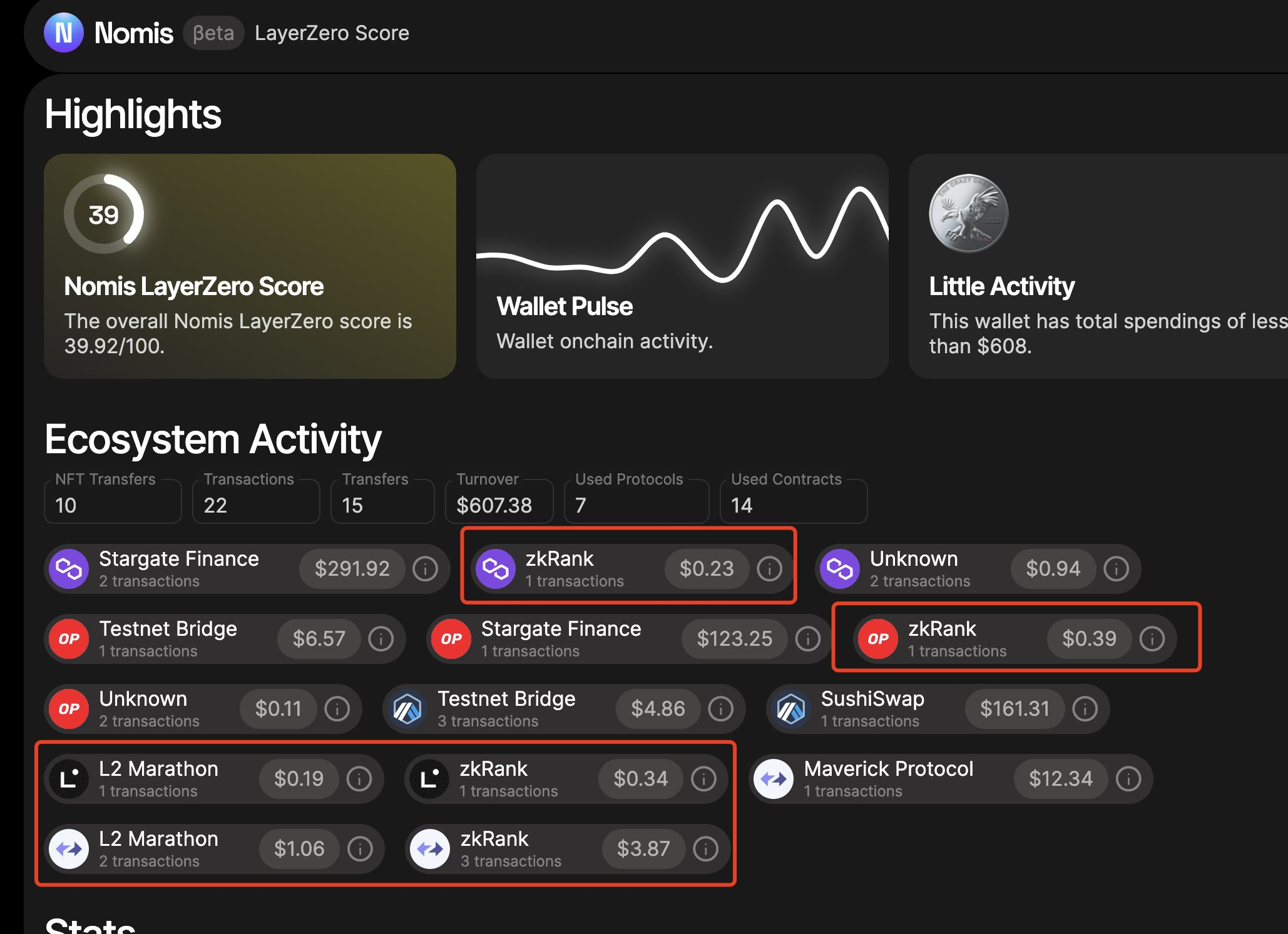 目前采用L0技术的项目越来越多,除了传统的stargate和小鳄鱼,现在sushix mav testnetbridge rndr tevaera zkrank l2marathon都被纳入了nomis的钱包评分。nomis肯定不会是空投的标准,但是可以很好地帮助用户了解自己使用过的L0协议,方便接下来的交互。