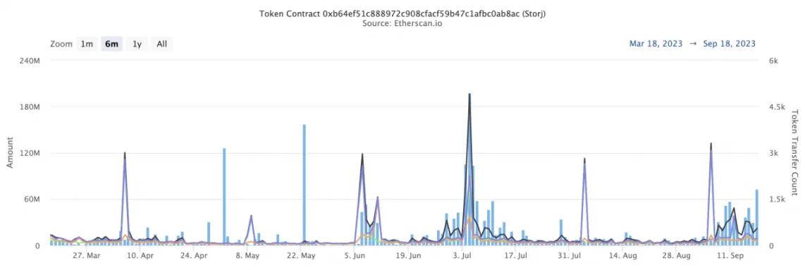 1)地址 0x3313:该地址活动开始时间为 9 月 15 日,陆续从币安、OKX 提币,累计从中心化交易所转出 2557.2 万枚 STORJ,占代币总量的 6.07%,其中由币安转入 1626 万枚,由 OKX 转入 931 万枚。