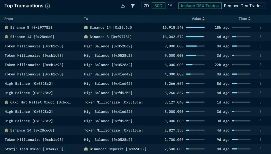 3)Storj team:向币安转入 250 万枚代币,目前钱包剩余 650 万枚 STORJ。