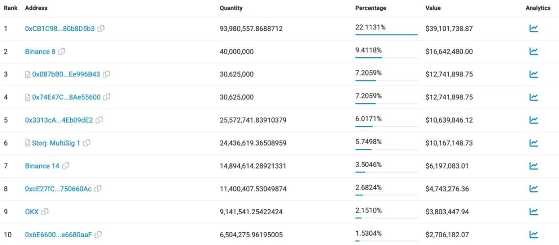目前前 10 大地址中,锁定代币和团队多签钱包中持有 20.1%,中心化交易所持有 15.4%,剩余地址持有 32.3%。