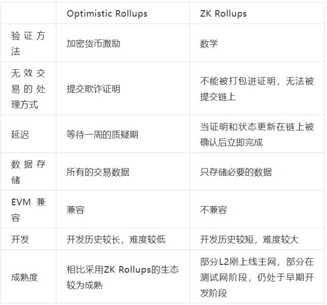 最初设计 EVM 的时候没有考虑到使用零知识证明技术。以太坊创始人 Vitalik 认为短期内 Zero Knowledge Rollup 存在技术上的复杂性,但最终在扩容战争中会战胜 Optimistic Rollup。以下是 Zero Knowledge Rollup 和 Optimistic Rollup 的对比。
