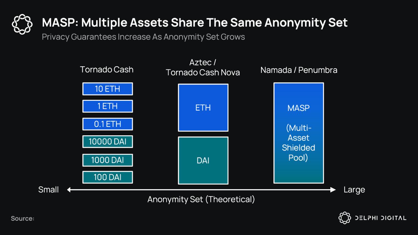 为了保护用户隐私并防止他人追溯收集数据,发送方、接收方、金额和资产面额都经过加密,通过零知识证明 zk-SNARKs 来保证资金的转移,它的独到之处是允许所有资产共享同一个屏蔽池(MASP)来提供可组合的资产保护增加用户匿名集,而不是每个资产单独屏蔽。参与者越多资产越多转移就更加频繁,这大幅增加了资产转移数据的隐匿程度;