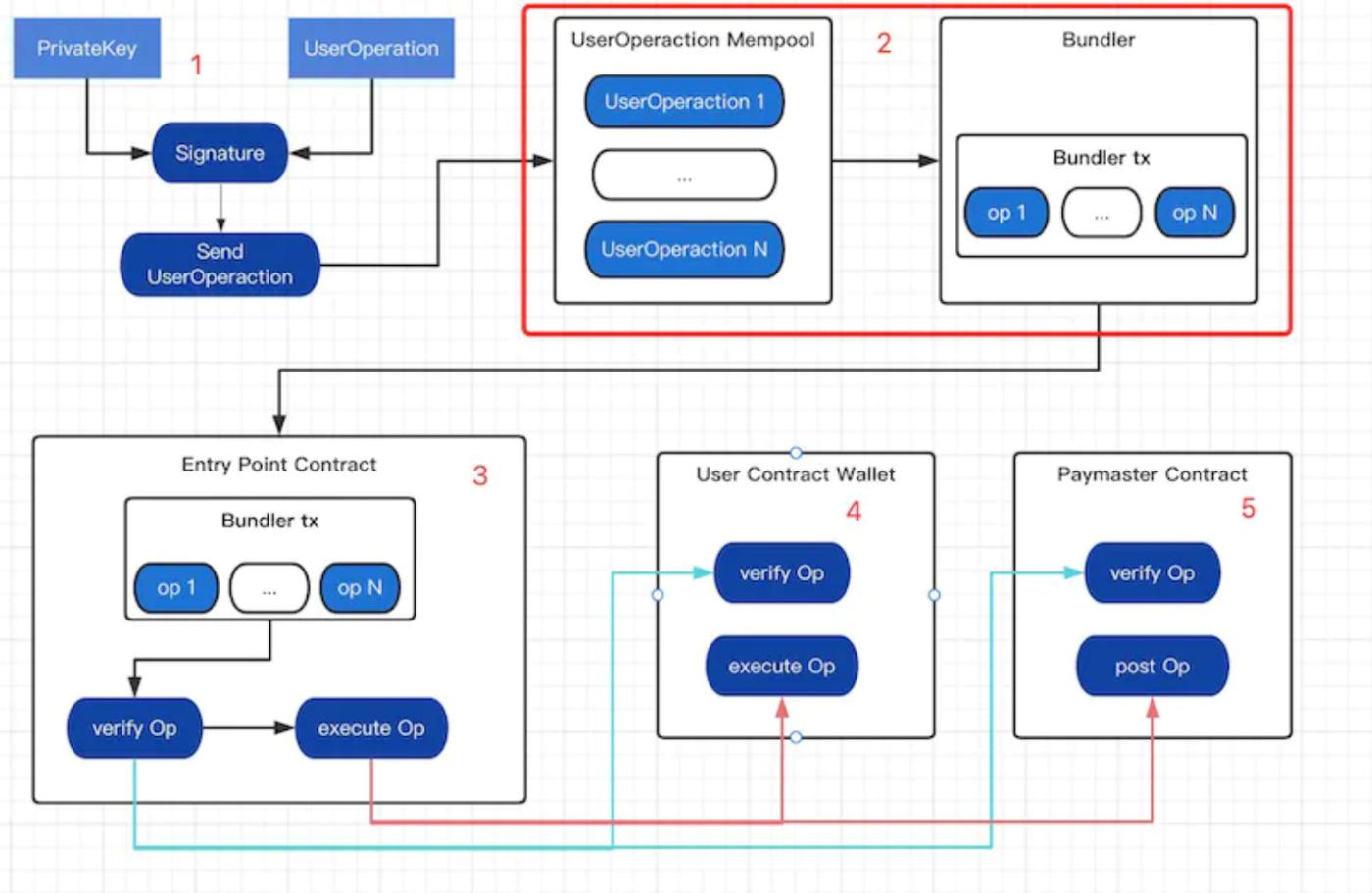 - 将操作发送到 P2P 「用户操作内存池(UserOperation Mempool)」 并由捆绑器对执行的签名,Gas 费用等用户操作交易内容进行「捆绑打包」提交上链(实际包含多种情况这里不做展开);