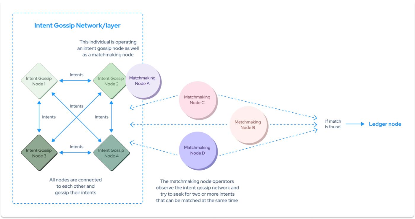 在以太坊 EVM 中,交易并不强制要求未来状态而是授权具体执行路径,而 Anoma 包含一个匹配系统,允许用户使用 Gossip 广播交易意图。简单来讲 Anoma 由两个主要部分组成:分布式账本和意图匹配系统,它们相互补充也可以单独运行,通过使用 Intent Gossip 运行节点、Token 交换求解器和请求新意图的 RPC 服务器,并将交易从匹配的意图提交到分布式账本中,从而帮助用户自动发现交易对手;