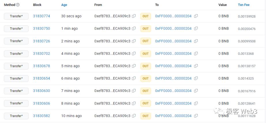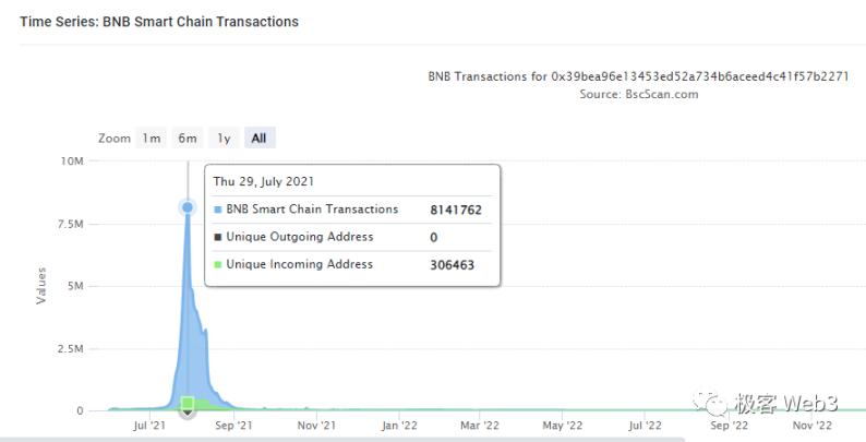 与 Solana、Heco 等由交易所扶持的公链类似,BNB Chain 的公链 BNB Smart Chain (BSC) 链对高性能的追求由来已久。从 2020 年上线初,BSC 链就把每个区块的 gas 容量上限设定在 3000 万,出块间隔稳定在 3 秒。在这样的参数设置下,BSC 实现了 100+ 的 TPS 上限(各种交易杂糅在一起的 TPS)。2021 年 6 月,BSC 的区块 gas 上限提升到了 6000 万,但在当年 7 月一款名为 CryptoBlades 的链游在 BSC 上爆火,引发的日交易笔数一度超过 800 万,导致手续费飙升。事实证明,此时的 BSC 效率瓶颈还是比较明显。