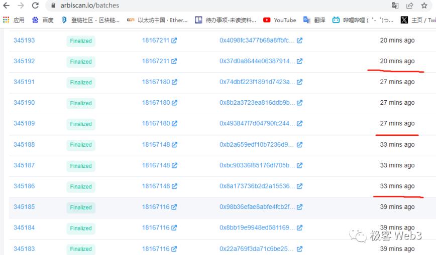 (Arbitrum 的排序器每隔 6~7 分钟发布一次交易批次)