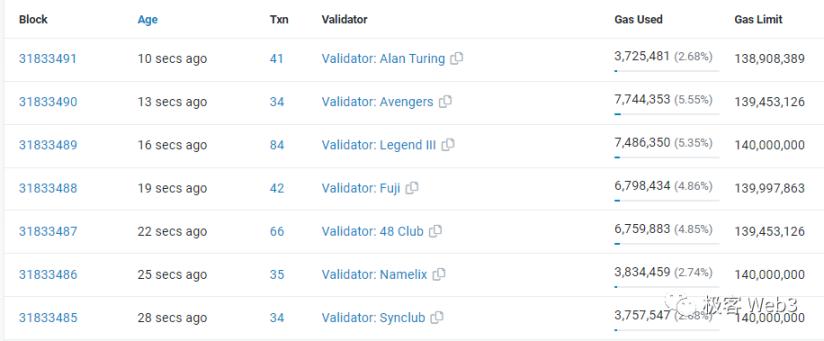 为了解决网络性能问题,BSC 再次将每个区块的 gas 上限上调,此后长时间稳定在 8000 万~8500 万附近。2022 年 9 月,BSC Chain 单个区块的 gas 上限提高到了 1.2 亿,年底时提高到了 1.4 亿,达到 2020 年时的近 5 倍。此前 BSC 曾计划把区块 gas 容量上限提升到 3 亿,或许是考虑到 Validator 节点的负担太重,上述超大区块的提议一直没有实施。