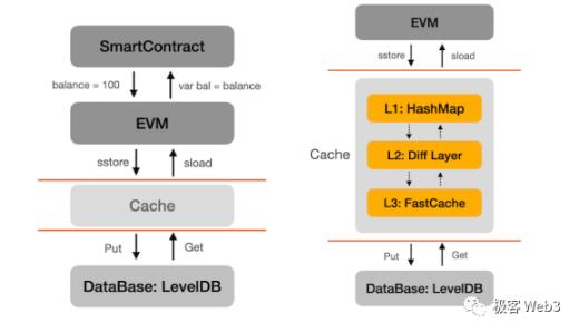opBNB 直接采用了 BNB Chain 用到的缓存优化方案。按照 opBNB 的合作方 NodeReal 披露的信息,最早的 BSC 链在 EVM 与存放状态的 LevelDB 数据库之间设置了 3 道缓存,设计思路类似于传统的三级缓存,把访问频率更高的数据放到缓存中,这样 CPU 就可以先去缓存中寻找需要的数据。如果缓存的命中率足够高,CPU 就不需要过分依赖磁盘来获取数据,整个执行过程的速度就可以实现大幅提升。