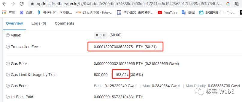 (Optimism 上一笔消耗 15 万 gas 的交易,手续费 0.21 美元)