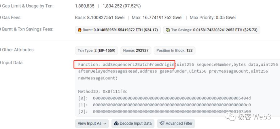 为了方便理解,此处需要介绍一下 Rollup 的 DA 数据发布方式。以 Arbitrum 为例,Layer2 排序器控制的以太坊链上 EOA 地址,会定期往指定的合约发出 Transaction,在这个指令的输入参数 calldata 中,写入打包好的交易数据,并触发相应的链上事件,在合约日志中留下永久记录。