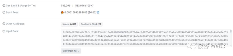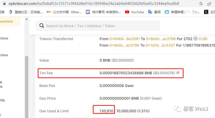 (opBNB 上一笔消耗 13 万 gas 的交易,手续费 0.004 美元)