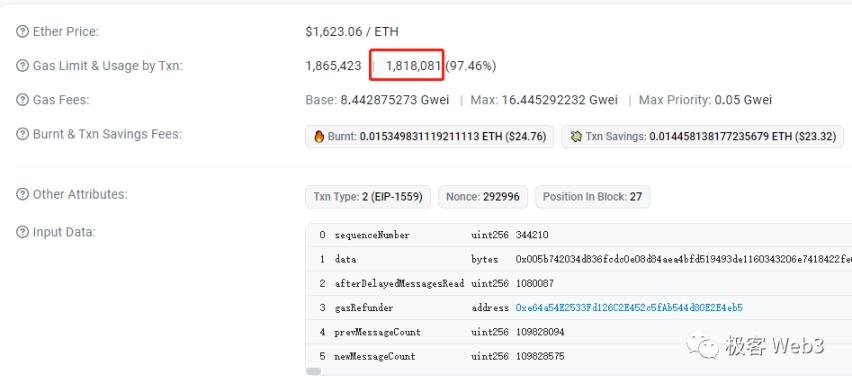 根据 Arbiscan 和 Etherscan 的数据,Arbitrum 某个交易批次包含了 1115 笔交易,在以太坊上消耗了 181 万的 gas。如此推算,如果把 DA 层每个区块都装满,Arbitrum 理论上的 TPS 极限约为 1500,当然考虑到 L1 区块重组问题,Arbitrum 不可能在每个以太坊区块上都发布交易批次,所以上面的数字目前只是纸面上的。