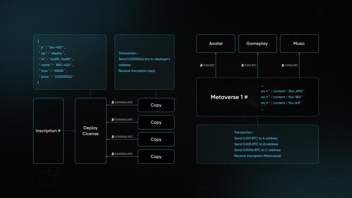 Brc420 的推出者是 Recursiverse,Recursiverse 诞生于递归铭文时期。Brc420 通过递归的方式定义了更复杂的资产格式,并完全开源,任何人都可以创建自己的元宇宙铭文。同时,Brc420 在单个铭文的基础上建立了使用权和版税之间的约束关系。当用户拥有一个铭文时可以分配其使用权并为其设定价格,此举可激励 Ordinals 生态更多创新。