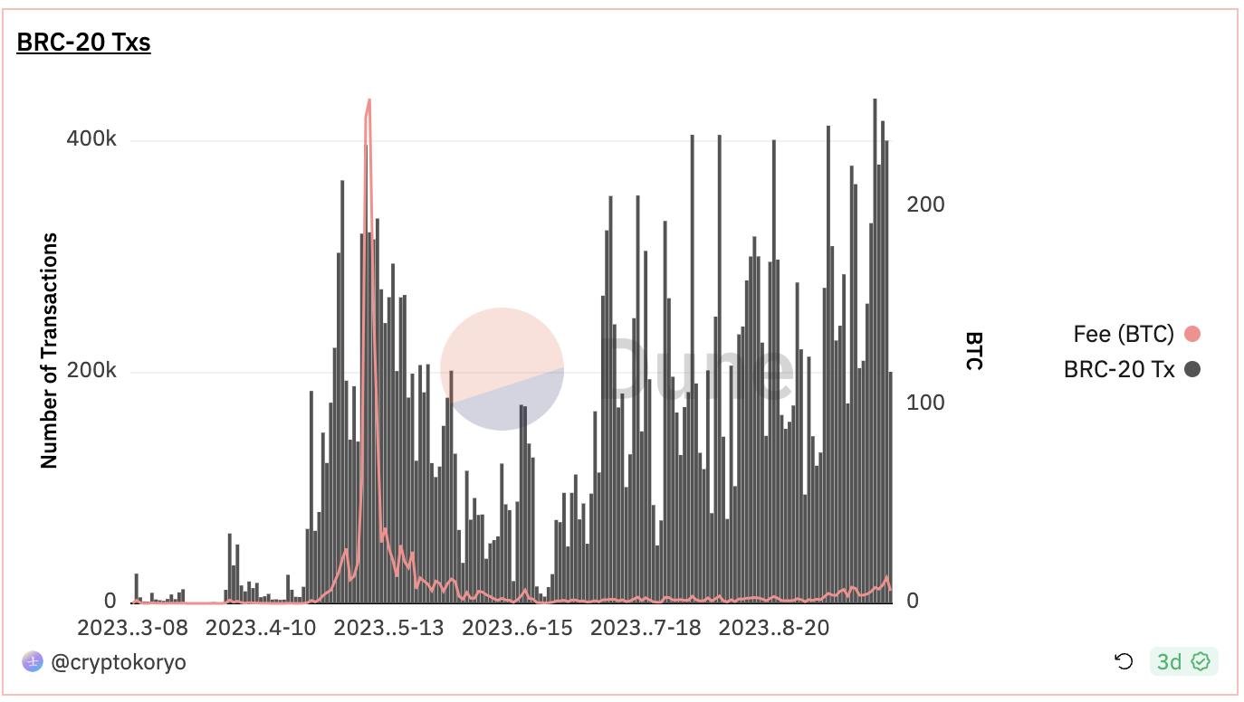 根据 Dune 数据显示,截至 9 月 23 日,Brc20 协议所产生的交易数为 2860 万次,产生的手续费达 1590 枚比特币,计 4240 万美元。以 ORDI 作为指数去观察,其巅峰时日交易额超 1 亿美元,目前日交易额最低降到 800 万美元。