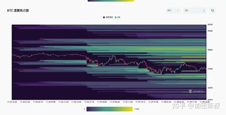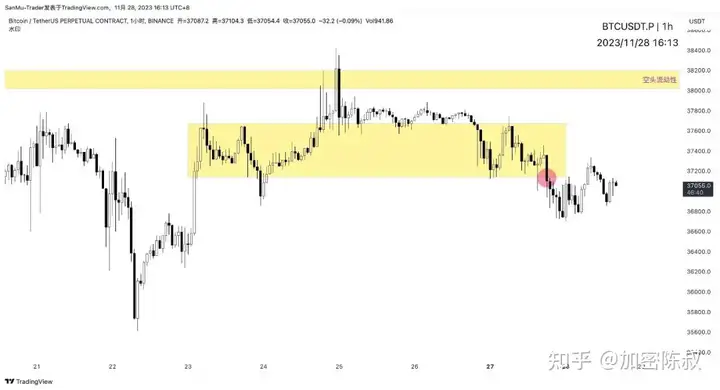我们通过清算图其实也能看到,现在上方的流动性还是不错的,高点也来到38000附近,如果这里小周期反转,市场可能会按照我们昨日视频第二种计划再度往上测试的走势。