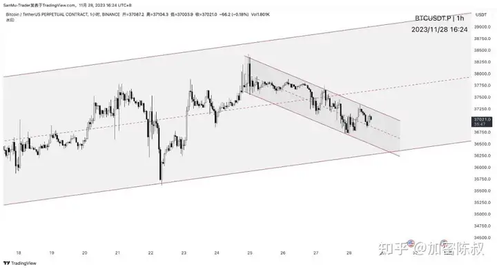目前价格还在小通道中,我认为空单继续持有没有任何问题,但是如果小通道被反转,向上开始突破,那格局将被改变,空单这个时候可能就要考虑暂时离场了。同时关注今天日内的高点37350附近,这里被突破确认小周期的下跌反转,市场是有概率再走强往上运行一次。