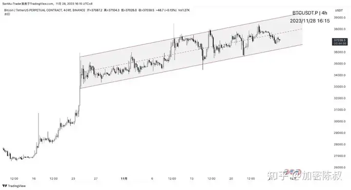 我们在4H周期中可以看到比特币正在走一个上涨通道,并且持续了1个月之久。
