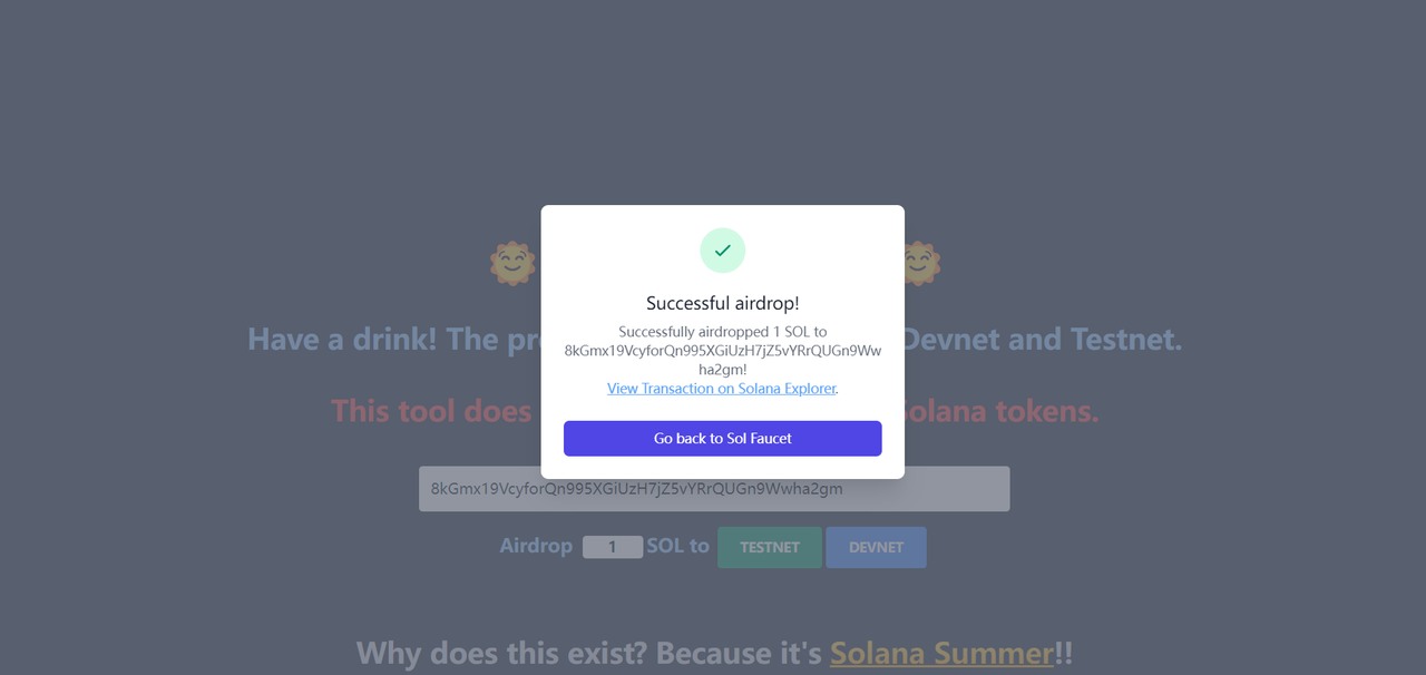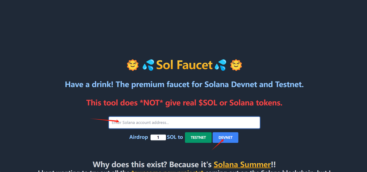 网址:https://solfaucet.com/将创建的 Phantom 钱包地址复制并粘贴到水龙头以接收测试代币。