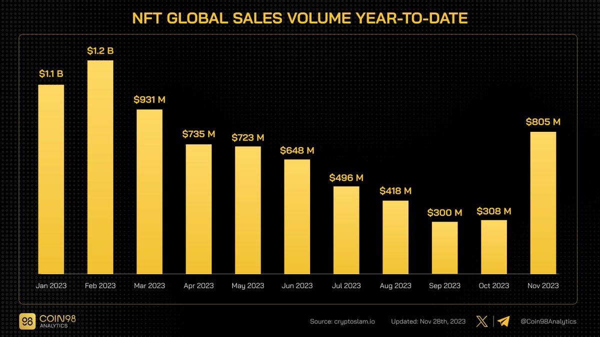 从9月至今,NFT销量呈现明显成长,3个月内销售量增加5.05亿美元