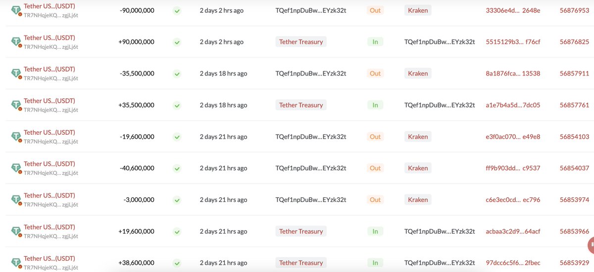 在 # TRON上,2.56B $USDT 透过存款地址「TQef1n」从 #TetherTreasury 转移到 # Kraken 。