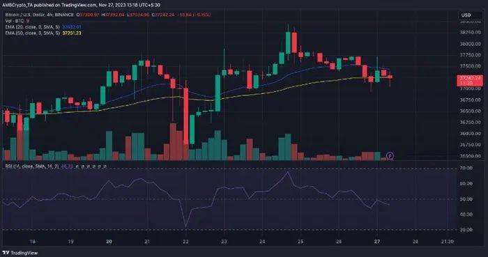 接下来,让我们再来看看比特币相对强弱指数(RSI)这一技术指标的走势,如上第五张图所展示的,目前比特币相对强弱指数已跌至46.23,此趋势表明卖家在市场上占据主导地位,如果这一指标跌破40,那么市场参与者可以将此视为打折购买比特币的机会并在该区间吸筹,那么购买压力可能会将BTC推向更好的走势方向。