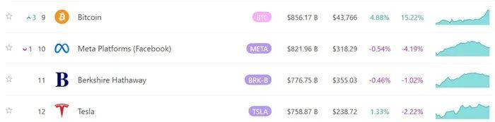 第一张图来自8marketcap披露的最新全球资产市值排名,其中显示,随着比特币价格的强势反弹,其市值已经超过了巴菲特的伯克希尔·哈撒韦、伊隆·马斯克的特斯拉、以及马克·扎克伯格的Meta(前Facebook)三大巨头企业,重新成为全球市值第九大资产。