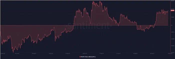 第三张图是链上分析公司Santiment展示的比特币180 天市值与已实现价值比率 (MVRV)走势,该图表显示,比特币持有者自目前保持盈利状态,只有偶尔趋势低于零,而且自2023年10月20日左右以来,MVRV一直保持在零以上的水平,最新数值显示,MVRV比例约为24%,这表明如果BTC持有者选择以当前市场价格出售,将获得超过20%的利润,这一趋势也表明,一旦出现全面牛市,更多地址可能会实现盈利。