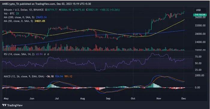 另一个值得关注的指标是指数移动平均线(EMA),目前20 EMA(上图蓝色线)高于 50 EMA(上图黄色线),这表明在几周内BTC的交易价格可能会继续保持在当前区域内。