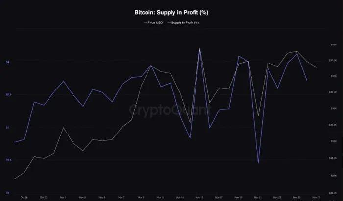 那么,如果历史重演,比特币在年底前价格上涨的可能性有多大呢?上面第四张图展示了CryptoQuant披露的比特币供应量和利润走势,当前该指标值为83.13%,较11月25日的84.36%有所下降,这其实是个利好走势,因为当该指标上升意味着投资者获利终结,可能会导致抛售压力,从而引发比特币价格下跌。