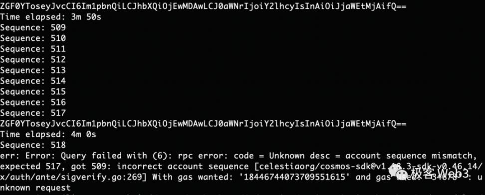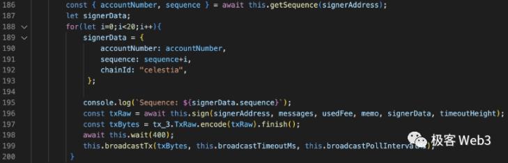 Sequence 只在每次泛洪周期开始前,拉取到本地,不必像 CosmJS 库默认的那样,每次交易后都向节点重新请求一遍 sequence。而 chainId 则写成固定的值,不必反复向节点请求。(编者注:这里的循环次数设置的比较低,显然作者还没那么暴力。某人在打 Conflux 铭文时,曾将每个周期的循环次数改为 1000,每分钟差不多发出去 200 笔不同的交易)