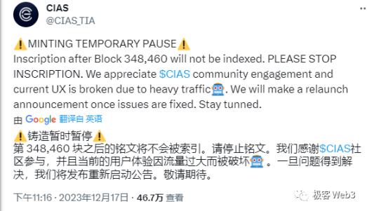 - 当天,CIAS 铭文官方眼见 Celestia 快扛不住,临时宣布 48460 号区块高度后上链的铭文铸造交易全部无效,颇有「交易所拔网线」之风。而且 CIAS 自己的网站也崩了。