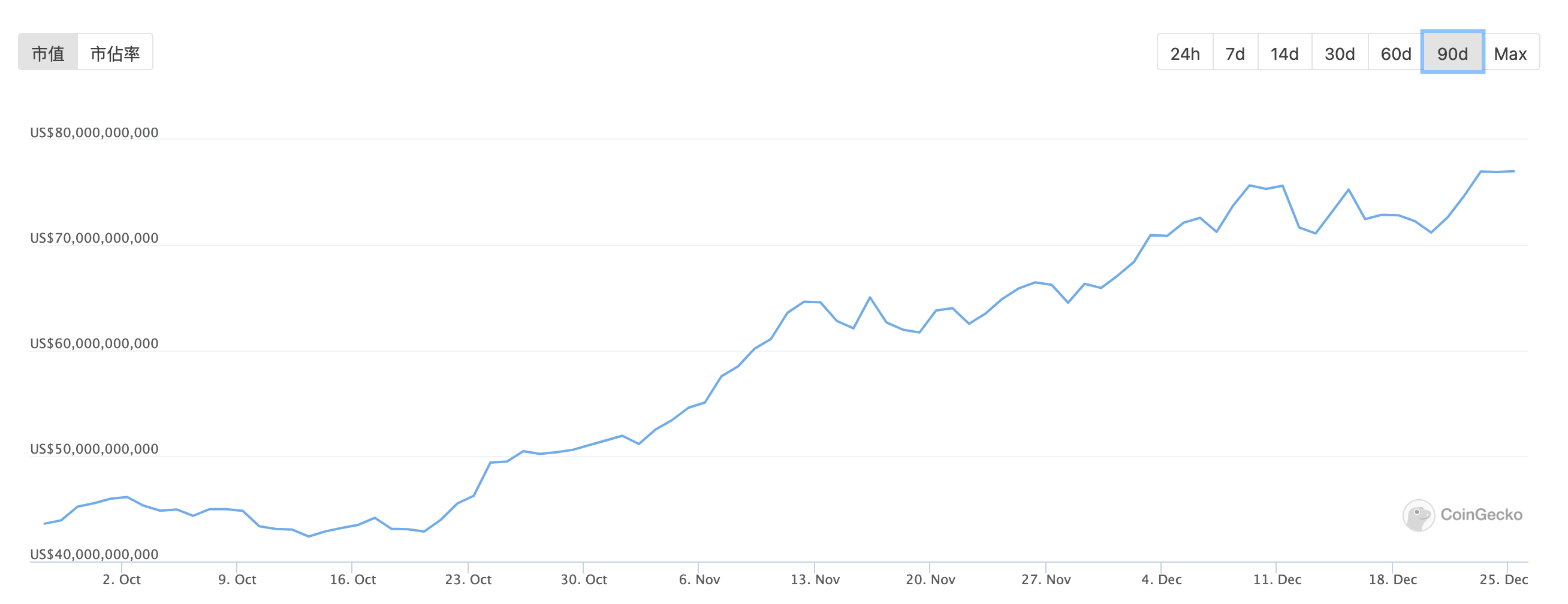 以 DeFi 协议的总市值来看,根据 Coingecko 数据,短短近 90 天 DeFi 总市值从 428 亿上升到 771 亿,涨幅达 80.1%。