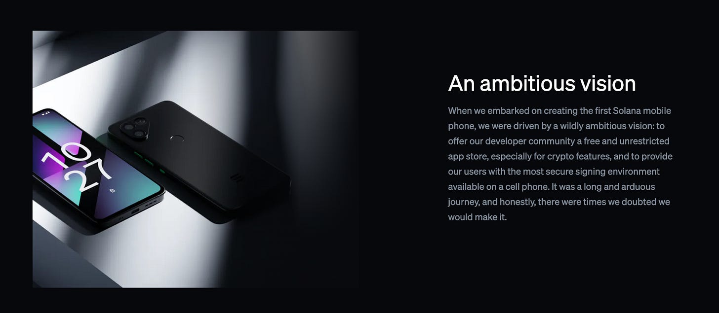 Solana Mobile Saga 是在 2022 年 6 月推出专为区块链打造的智慧型手机,以 Android 系统介面为基础,让用户可以更轻松的用内建功能保管链上钱包、交易 NFT 并与去中心化应用程式(dAPP)交互,一代机初始的定价是 1,000 美元,在熊市中因销售量不佳一度降价到 599 美元。