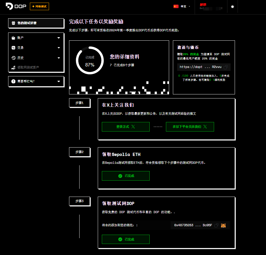其他任务可以访问Galex任务:https://galxe.com/DOP/campaign/GCGpDttPdU 按要求完成。
