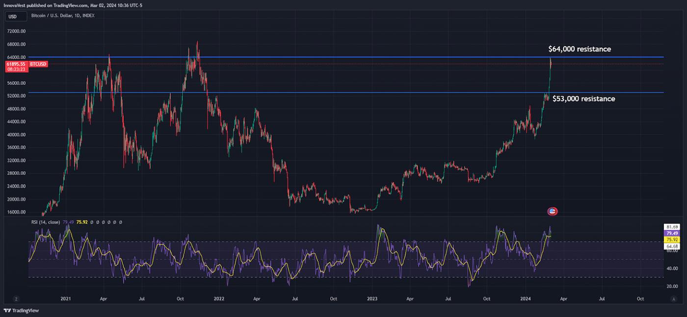 上周一,现货BTC价格突破 53,000 美元左右的阻力位,开始大幅上涨。正如我们在过去一周中提到的,一旦突破该水平, BTC上涨至历史高点的阻力就很小。事实上, BTC上周三曾短暂触及 64,000 美元,然后在本周末跌至 62,000 美元区间。