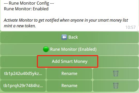 当聪明钱开始 mint 某个 Runes token 的时候,会在 Telegram 自动弹出提醒,点击 mint 即可开始 mint。最多可添加 20 个聪明钱地址。
