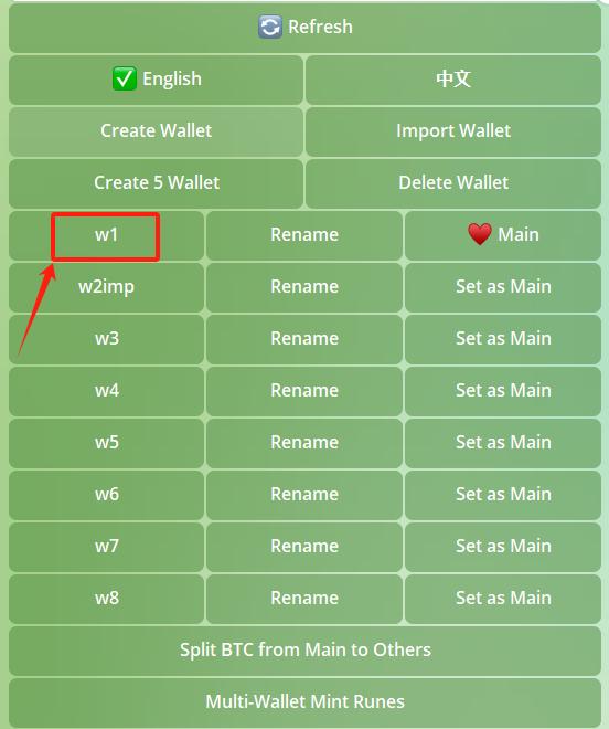 首页点击某个钱包,如 w1。也可以点击“menu”中的“main”。