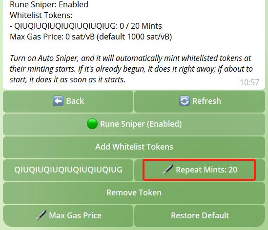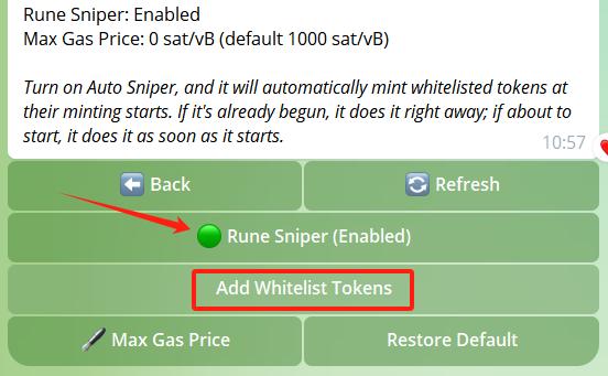 添加白名单(Whitelist)名称,可针对每个 token 设定 mint 张数,点亮 Rune Sniper,自动狙击 AutoSniper 已经设置完成。