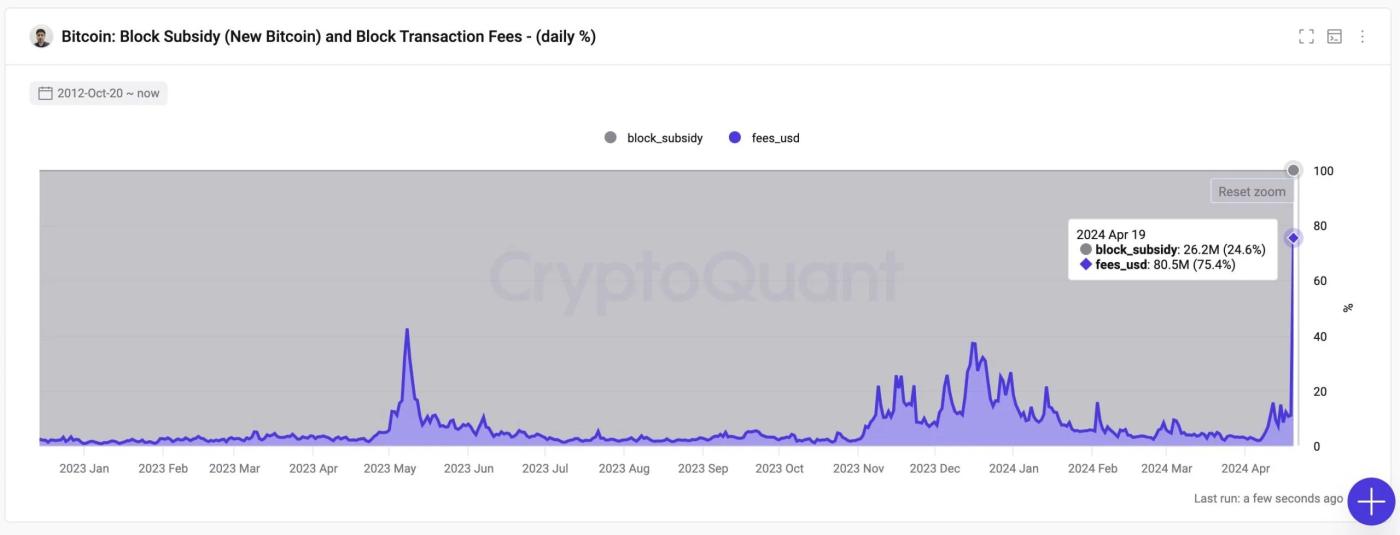 Followin消息,据推特KOL BItwu.eth发文称,其查看CryptoQuant和Dune数据显示,BTC矿工单日收入达到1.07亿美元,创下历史新高,大幅超越2021年4月创下的7700万美元单日纪录。