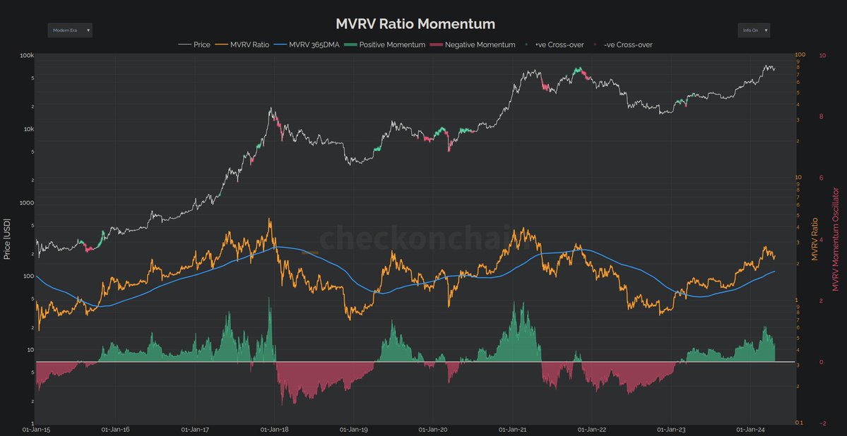 我最喜欢的跟踪 #Bitcoin 趋势弹性的指标之一是 MVRV 动量。 这是一个简单的工具,用于查看与 MVRV 1 年平均值的交叉。 当大量顶级买家陷入巨额未实现损失时,顶级(高风险)市场就会跌破。