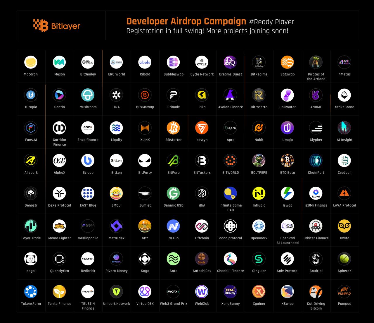 Bitlayer生态正在逐渐成形。根据我们的最新数据,目前已有超过300个团队报名参与我们推出的开发者激励空投活动Ready Player One。