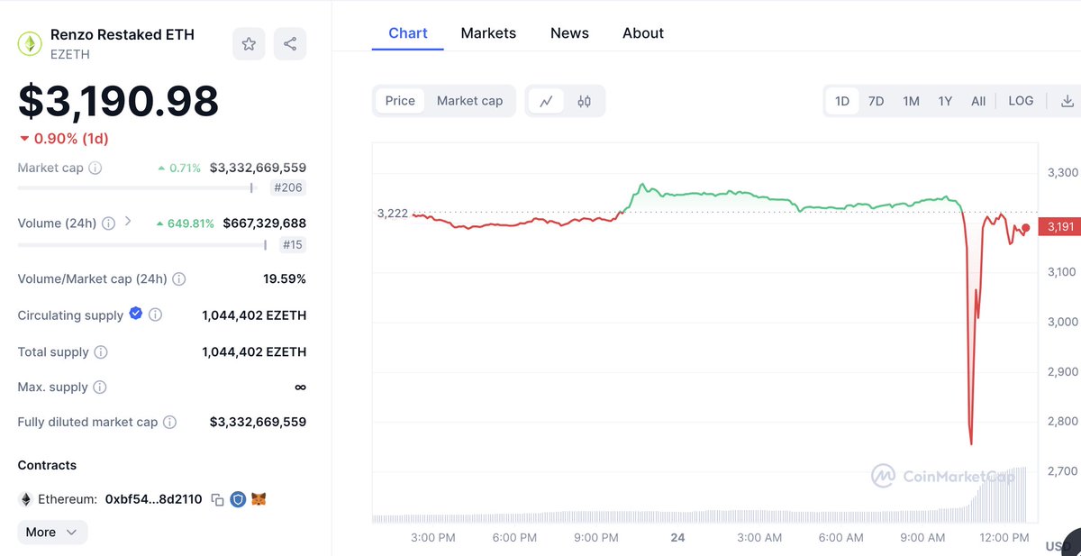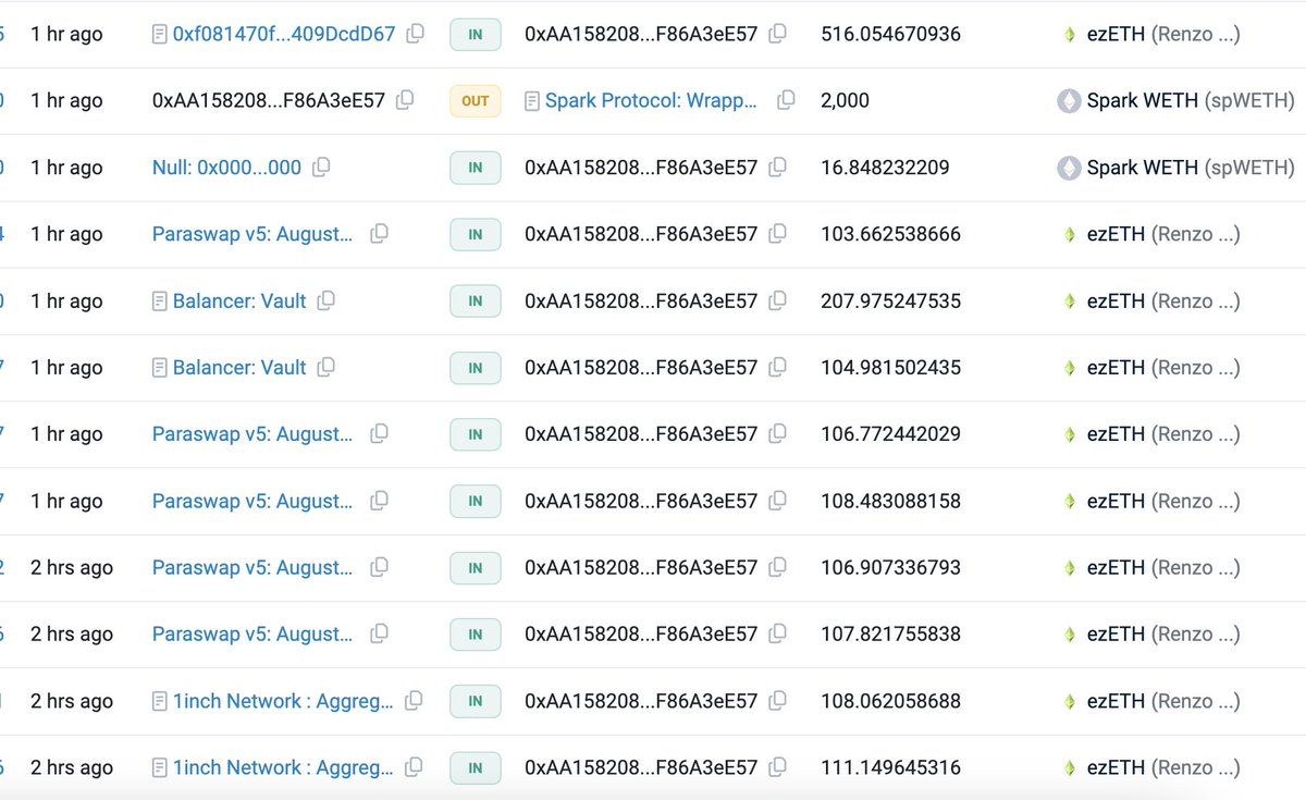 在 $EZETH(Renzo Restaked ETH)脱钩后仅 2 小时内 czsamsunsb.eth 就达到了 121.65 $ETH! 他花费 4,099 $ETH 成功购买了 4,221 $EZETH,赚了 121.65 $ ETH! etherscan.io/address/0xaa15820...