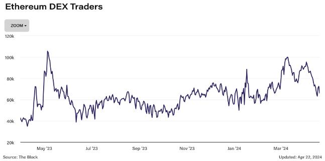 以太坊上的去中心化交易所( DEX )用户数量已下降2 月份以来的最低水平,上周仅为 63,000 人,而本月初则超过 95,000 人。在memecoin繁荣和整体加密货币市场上涨的促使,3 月初经历了一段大幅增长期,之后出现了这种下降。