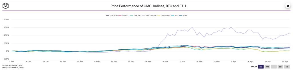 以太坊上 DEX 活跃度的下降反映了整体市场趋势。追踪 memecoin 表现的 GMCI MEME指数在 4 月份大幅下降。此外,由于对中东冲突的担忧,中心化交易所(CEX)的现货交易量在 4 月中旬有所恢复,但 DEX 本身并未出现类似的复苏。