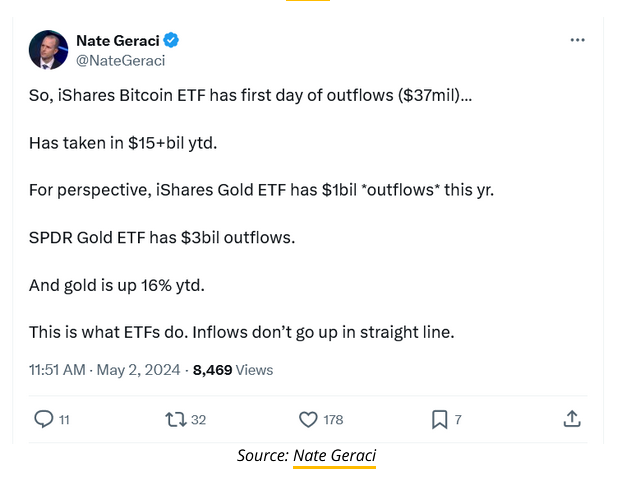Cointelegraph05-02本文为机器翻译展示原文5 月 1 日,美国现货比特币 ETF 的总流出量创下历史新高,其中首次包括@BlackRock 的 IBIT。根据 HODL15 Capital 的数据,贝莱德的比特币基金在 5 月 1 日流出 3660 万美元。 其他 9 只比特币 ETF 的资金流出总额为 5.268 亿美元。相关赛道:减产概念来自推特免责声明:以上内容仅为作者观点,不代表Followin的任何立场,不构成与Followin相关的任何投资建议。喜欢收藏 评论分享相关推荐Foresight News蚊子肉,滚出 10 万美元利润SOL4.17%動區動趨贝莱德宣布购买Uniswap 平台币UNI! $ UNI跳涨23%UNI3.9%ME News今夜,美国非农或现“百万级”下修