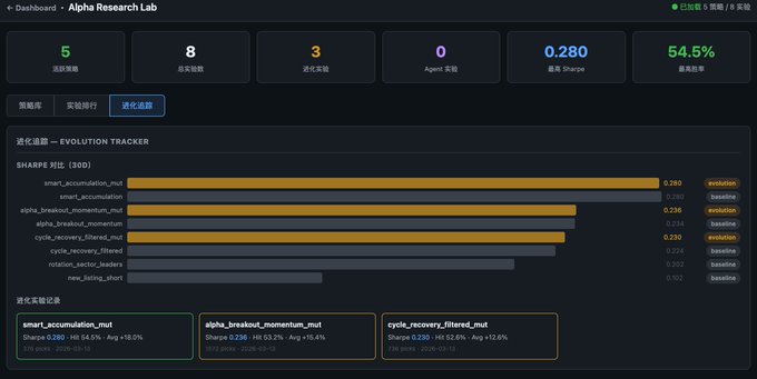 用 @karpathy 的自进化框架,开始跑策略,ai自己每天研究交易策略,不断测试,自我演进/留存/淘汰。 核心思想: 1️⃣evolutionary search(进化搜索) 2️⃣trajectory improvement(记录历史尝试) 3️⃣context engineering
