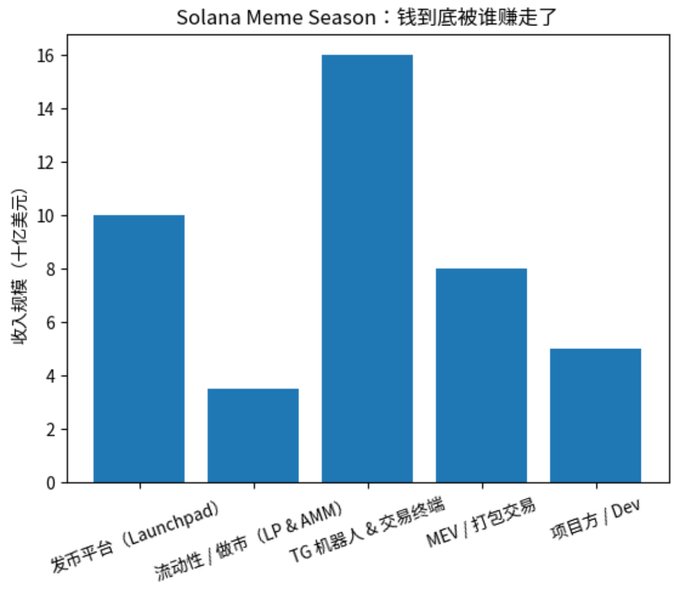 读到一篇英文分析,到底谁在市场上赚钱,顺手整理了一下 当散户在 Solana 的赌场里搏命时,真正把钱拿走的,从来不是赌桌上的赢家,而是卖铲子的人。 过去一个 meme season,Solana 的“卖铲子体系”合计抽走 40 亿美元以上。 1.Launchpad(发币平台)≈ 10 亿美元